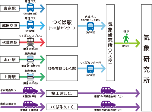 JRひたち野うしく駅(東口1番のりば)から「つくばセンター」行きに乗車、「気象研究所」で下車します。
